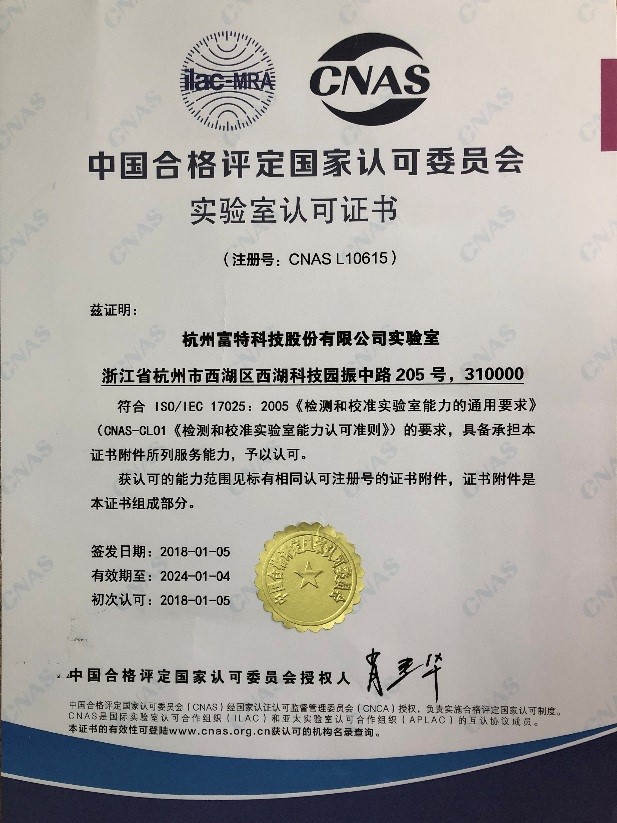 “杭州富特科技股份有限公司實驗室”以構建顧客滿意為目標,以科學管理力為基礎,以精心檢測為核心,通過優質高效的檢測技術,實現一流的檢測實驗室。“杭州富特科技股份有限公司實驗室”為公司產品認證的重要基地,該實驗室獲得中國合格評定國家認可委員會認可的批復,符合實驗室能力認可準則的要求,具備承擔證書附件所列服務的能力。提升公司整體研發技術水平,提高公司產品的核心競爭力。